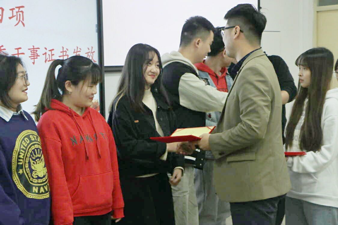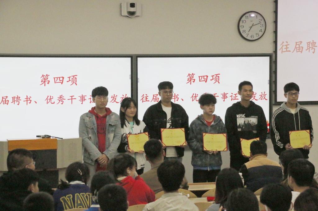 孙君老师为上一届员工会、团委、科协、青协主席团颁发聘书,并为优秀干事证书发放。