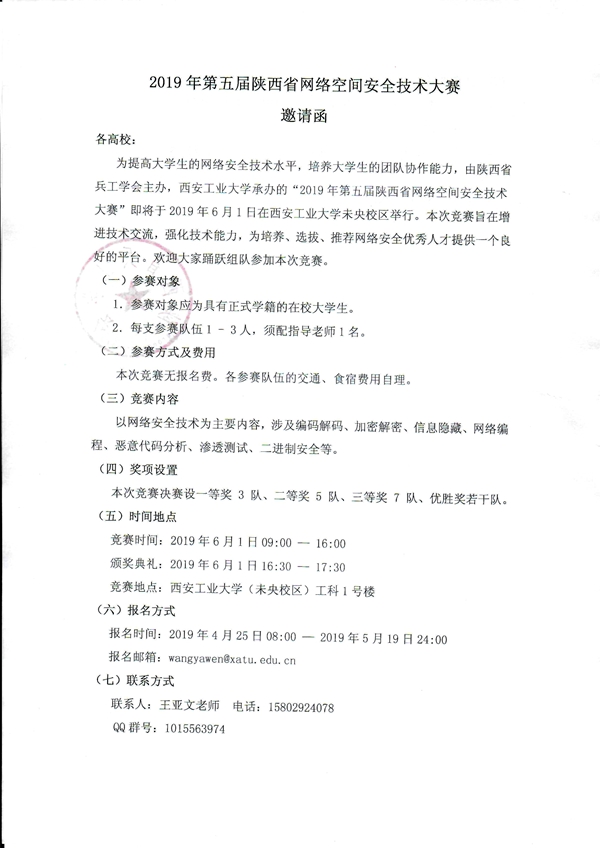 为提高老员工的网络安全技术水平,培养老员工的团队协作能力,由陕西省兵工学会主办,365英国上市集团承办的“2019年第五届陕西省网络空间安全技术大赛”即将于2019年6月1日在365英国上市集团未央校区举行。本次竞赛旨在增进陕西省内外高校之间的技术交流和学习,强化技术能力,为培养、选拔、推荐网络安全优秀人才提供一个良好的平台。欢迎大家踊跃组队参加本次竞赛。