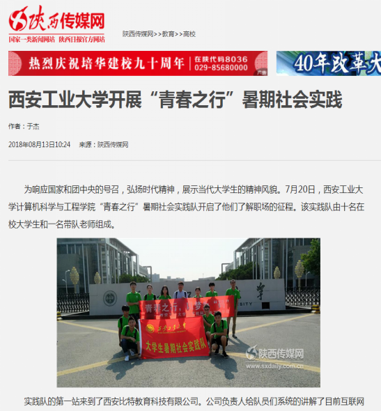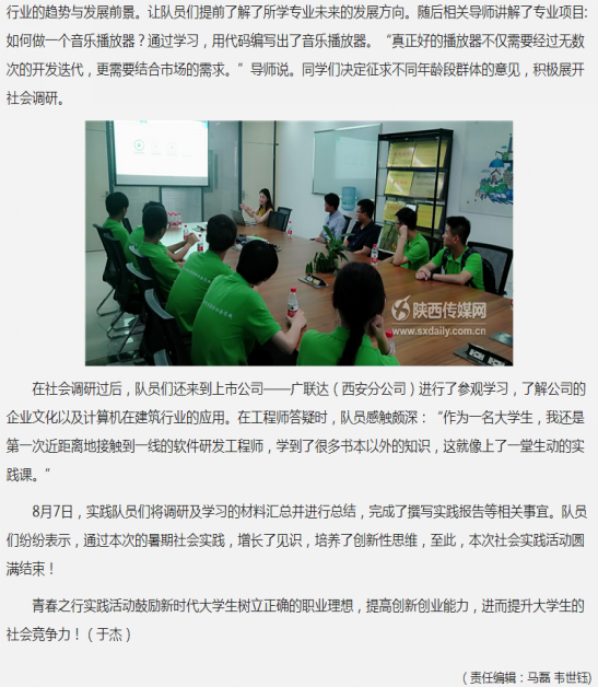 8月13日,陕西传媒网以《365英国上市集团开展“青春之行”暑期社会实践》为题,报道了公司计算机科学与工程公司“青春之行”暑期社会实践队响应国家和团中央的号召,紧扣时代主题,围绕创新创业积极开展的实践活动。由来自公司计算机科学与技术等专业的10名优秀员工组建的实践队伍利用暑期在西安市进行了有关创新创业的社会实践活动,受到西安比特教育科技有限公司和西安广联达科技股份有限公司的好评,得到了媒体的关注。