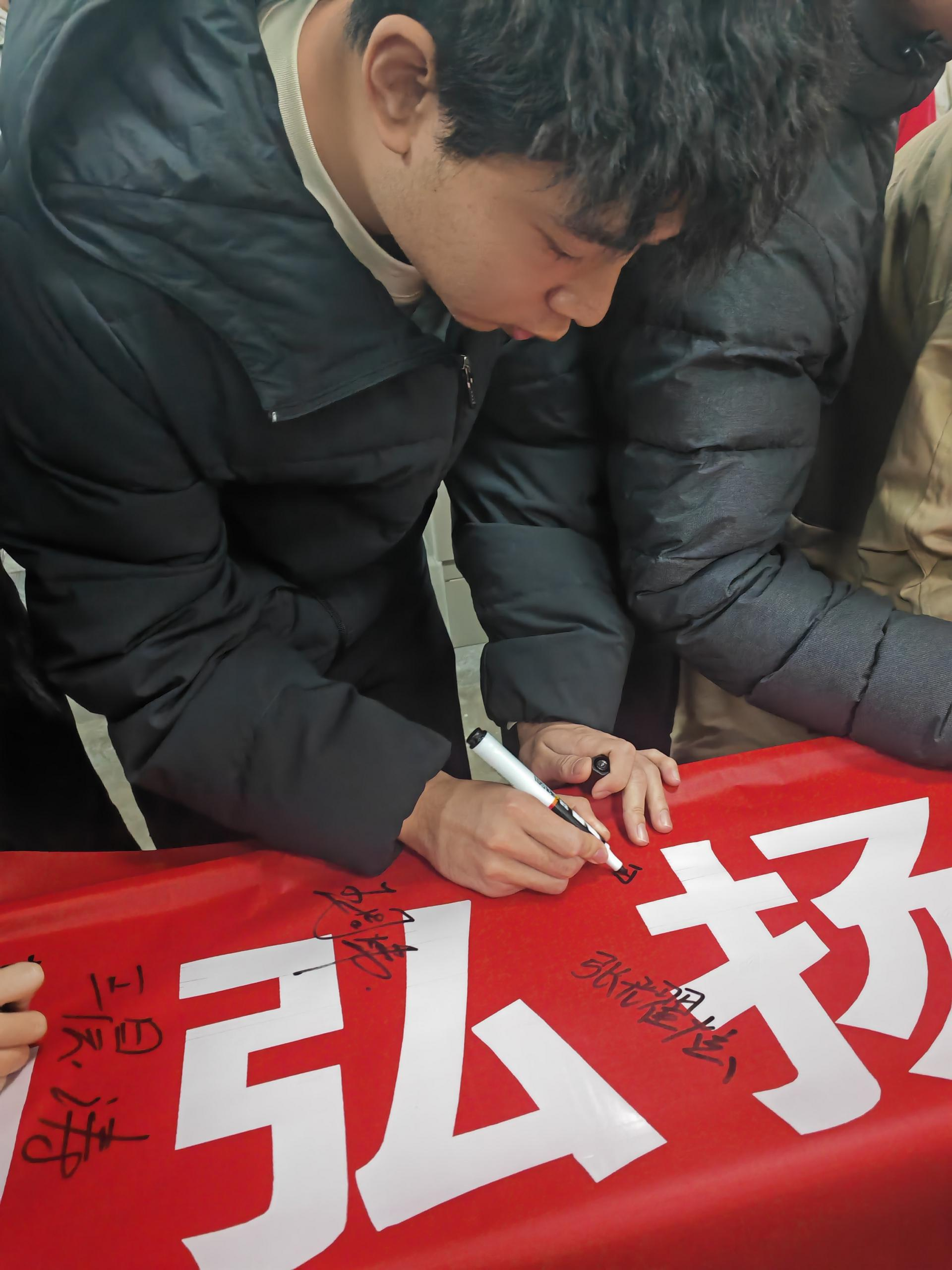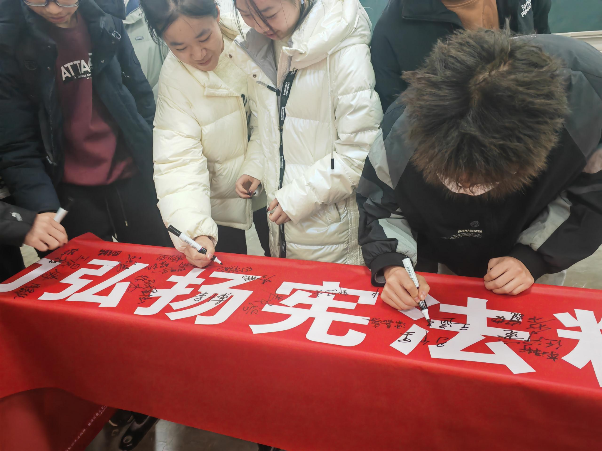 首先,团委员工干部向大家介绍了有关宪法的基本知识,让在场每位同学都对宪法有了初步的认识。随后,大会向同学们播放“宪法与我们的一生”宪法学习视频短片,通过视频让同学们意识到学习宪法的重要意义。最后,现场全体同学在学宪法标语上签字并共同合影留念。