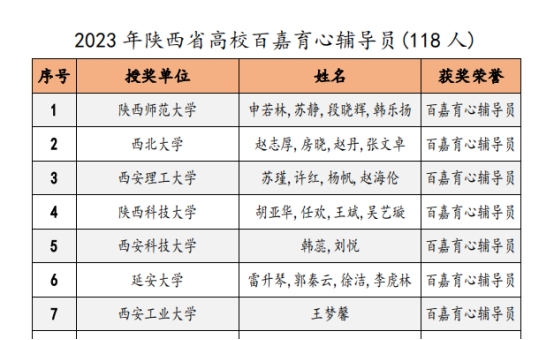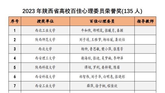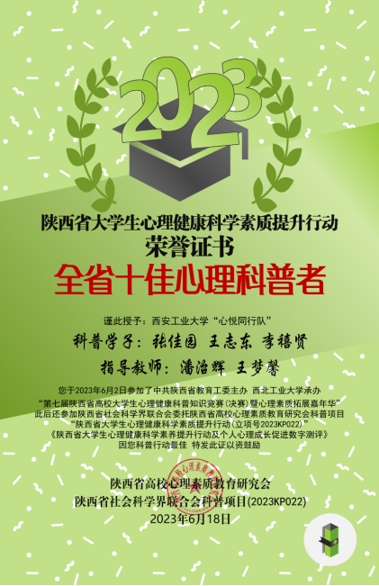 近日,陕西省高校心理素质教育研究会对2023年陕西高校心理育人相关工作进行表彰。英国365集团官网辅导员王梦馨被评为“百嘉育心辅导员”,公司员工程佳欣被评为“百佳心理委员”。此前,在2023年第六届陕西高校老员工心理健康科普知识竞赛暨心理素质拓展运动嘉年华决赛中,公司张佳园同学参与组成的“心悦同行”代表队在决赛中荣获二等奖并获得“全省十佳心理科普者”称号,辅导员王梦馨作为指导教师获奖。
