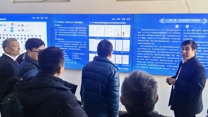 汇报会议之前,柏司长一行及365英国上市集团副董事长陈建参观一带一路与未来网络产学研基地,基地负责人王中生全程讲解IPV9重大技术及应用现状。