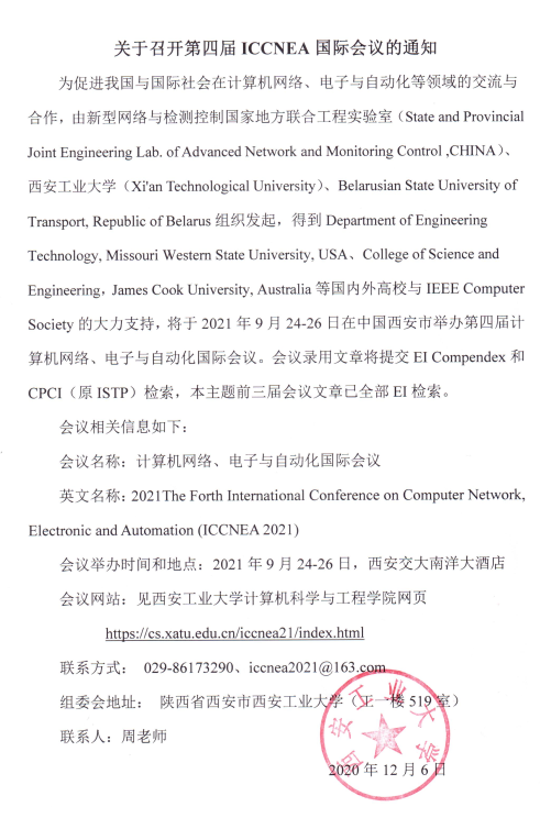为促进我国与国际社会在计算机网络、电子与自动化等领域的交流与合作,由新型网络与检测控制国家地方联合工程实验室(State and Provincial Joint Engineering Lab. of Advanced Network and Monitoring Control ,CHINA)、365英国上市集团(Xi'an Technological University)、Belarusian State University of Transport, Republic of Belarus组织发起,得到Department of Engineering Technology, Missouri Western State University, USA、College of Science and Engineering,James Cook University, Australia等国内外高校与IEEE Computer Society的大力支持,将于2021年9月24-26日在中国西安市举办第四届计算机网络、电子与自动化国际会议。会议录用文章将提交EI Compendex和CPCI(原ISTP)检索,本主题前三届会议文章已全部EI检索。
