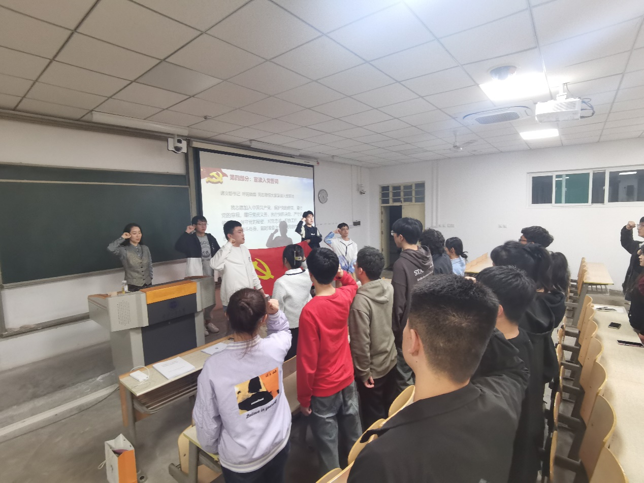 大会第四项:支部书记呼延晓蓉同志为新接收的预备党员佩戴党徽,带领全体党员一同面向党旗重温入党誓词,本次大会圆满结束。