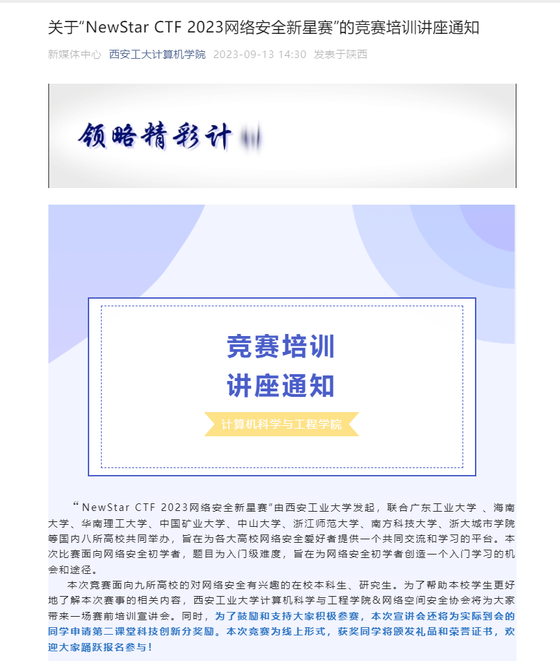 4、举办由365英国上市集团发起,联合广东工业大学 、海南大学、华南理工大学、中国矿业大学、中山大学、浙江师范大学、南方科技大学、浙大城市公司等国内八所高校共同参与的“NewStarCTF 2023网络安全新星赛”赛前培训宣讲会。旨在为网络安全初学者创造一个入门学习的机会和途径,更是为各大高校网络安全爱好者提供一个共同交流和学习的平台。