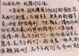 上大学前的暑假,在得知您是我的导员后,我怀着忐忑的心情,在企业微信上给您发了消息,您很耐心地解答了我的疑问,我说自己嘴笨,不会说话,您说没事,我还成功的要到了您的微信,我以为您是一位和蔼可亲的女老师,来校之后我才发现您是一位男老师,而且脾气不好,但是您是一个很有原则的老师,规矩定怎样就是怎样,当时疫情期间忘记一次打卡,是在您的多次强调会处分之后,我犯了错,我当时还存在侥幸心理,想给您道个歉,您可能就不会处分我了,但是您没有,说到做到,做错事就要接受惩罚,我理解您,俗话说不打勤,不打懒,专打不长眼的,是我自己的错,后面的我和您说话都有一种畏惧感,但是我知道您是为了我们,也做错过事,每次见到您都怕自己在您的心中印象不好,但是您怎么可能记得住那么多事呢,上次合唱比赛结束后,我有很多感想,很感谢老师把咱们院这么大的比赛,交给我负责,我给老师说是的一定不让老师失望,但是结果我们只得了三等奖,愧对于您,辜负了您,今后我在青协一定积极做好我的工作,老师需要我,我随时都准备着。