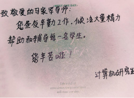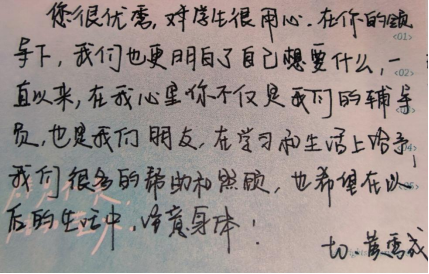 您总是让我感动。您不仅会传授专业知识,还时常关注我们的心理健康和生活状态。在我感到压力和迷茫的时候,您总是会开导我、鼓励我,并给我提供实际有效的帮助。您像一盏明灯,为我照亮前行的道路。我很感激您的指导和关怀,这些都让我更加坚定了自己的目标和信念。